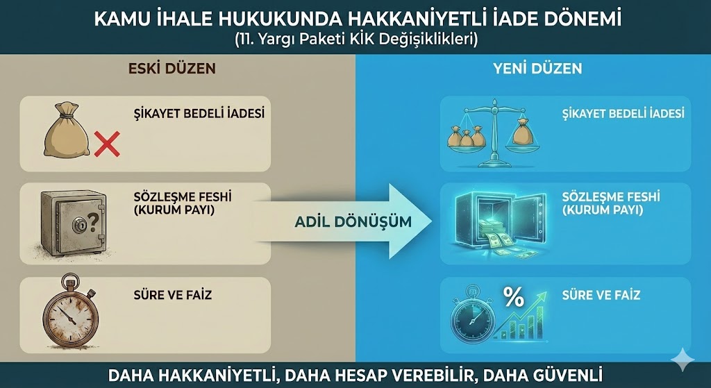 Yeni düzenleme ile artık “Haklılık Oranı” kavramı geldi. Başvuru sahibi dilekçesinde 5 farklı iddiada bulunduysa ve Kurul bunlardan 2’sini haklı bulup 3’ünü reddettiyse, ödenen başvuru bedelinin %40’ı ($2/5$ oranı) iade edilecek. Ancak eğer başvuru usulden reddedilirse (m. 54/11-c) veya sadece “eşit muamele” ilkesi üzerinden bir düzeltme/iptal kararı verilirse bedel iade edilmeyecek. Ayrıca iade talebinden itibaren 15 gün içinde ödeme yapılmazsa KİK artık kanuni faiz ödemek durumundadır.